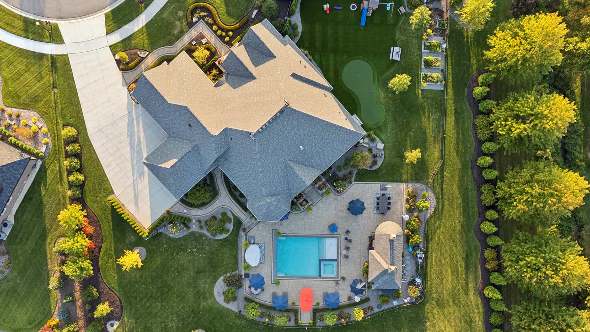 This custom landscape design blends refined structure with functionality, creating an outdoor environment ideal for both leisure and play.