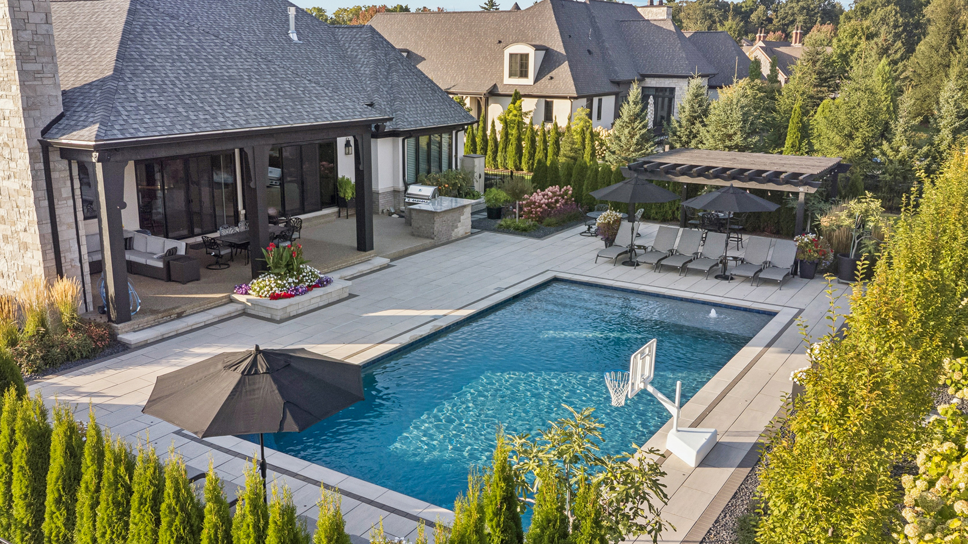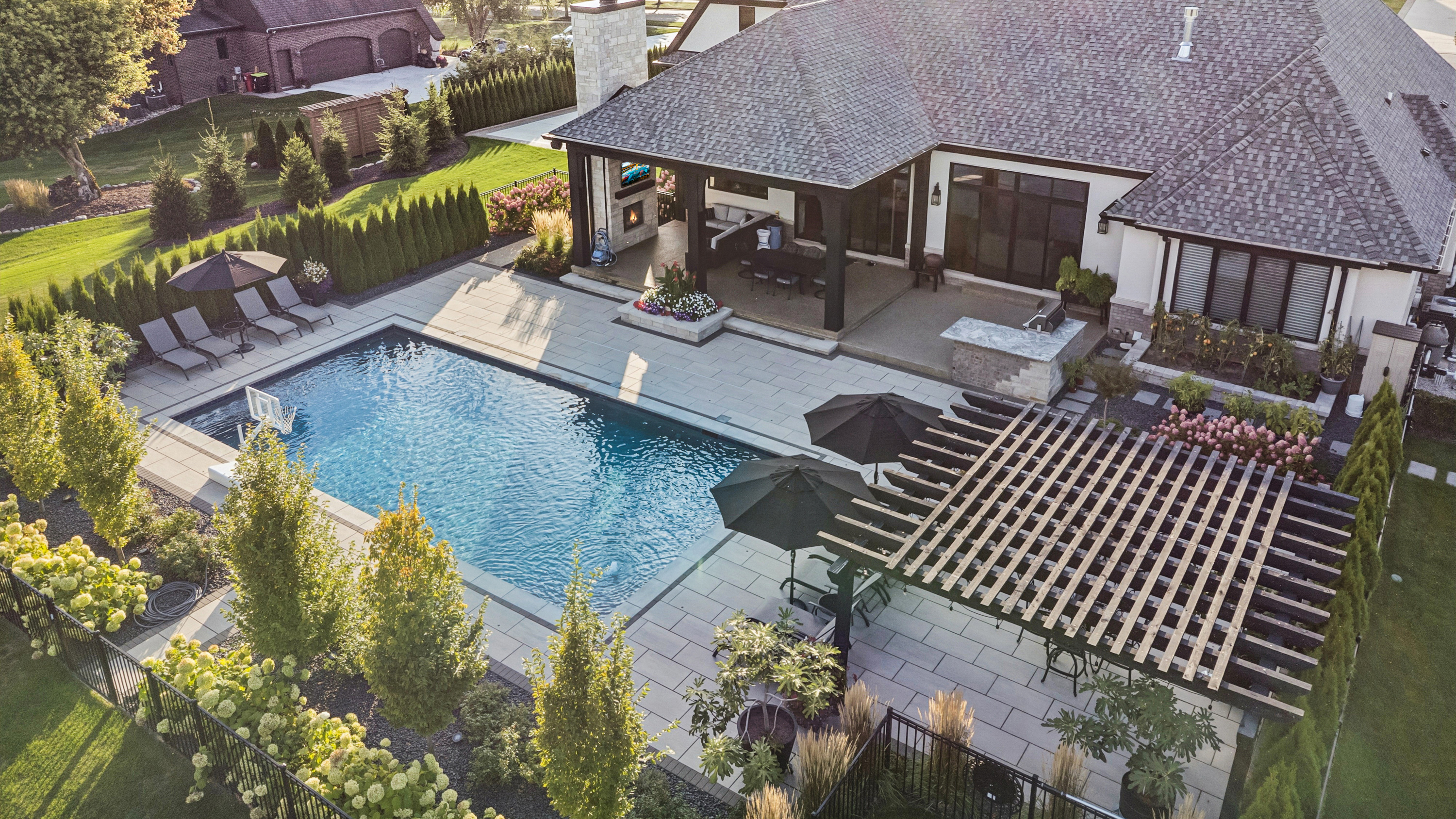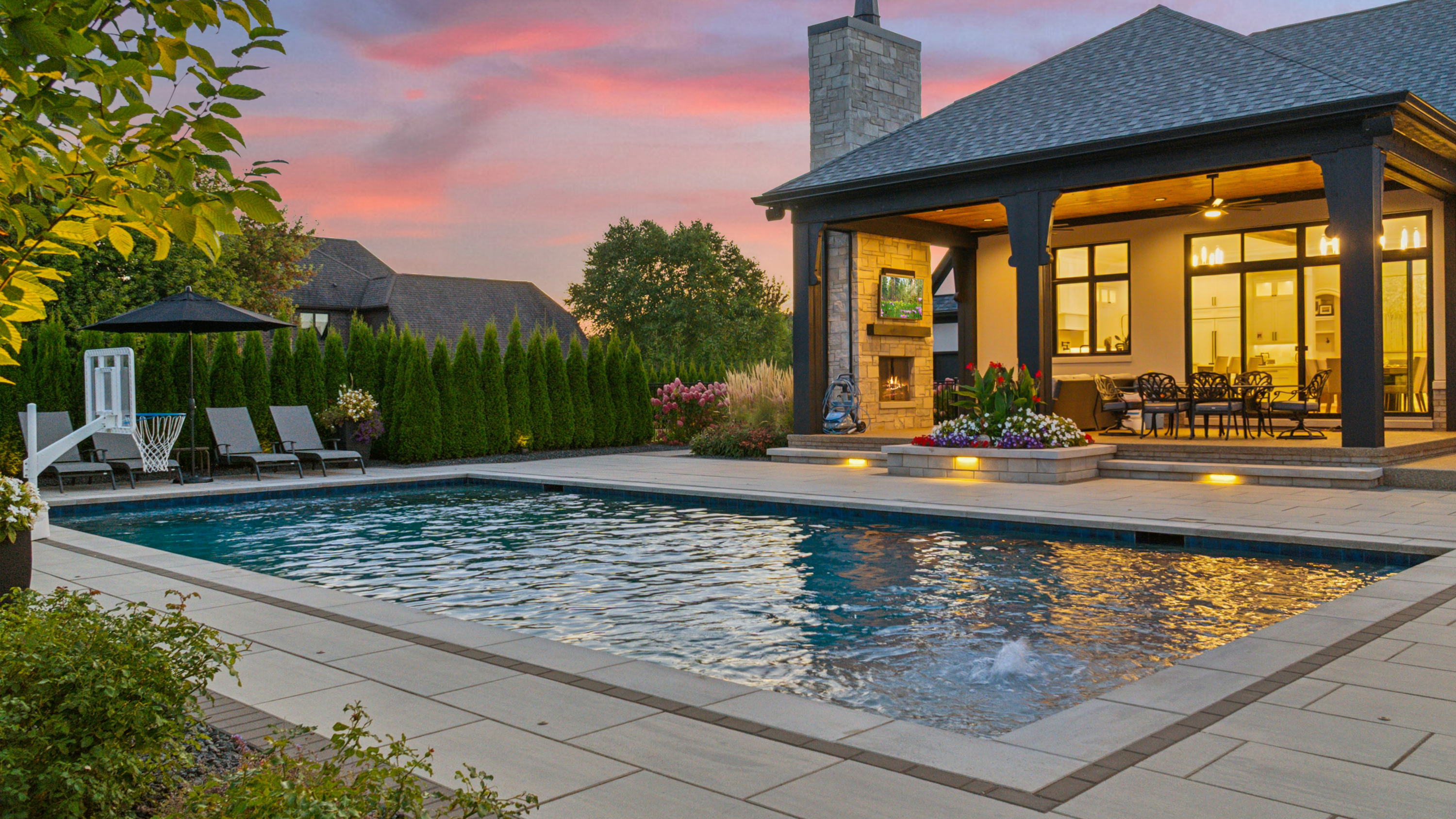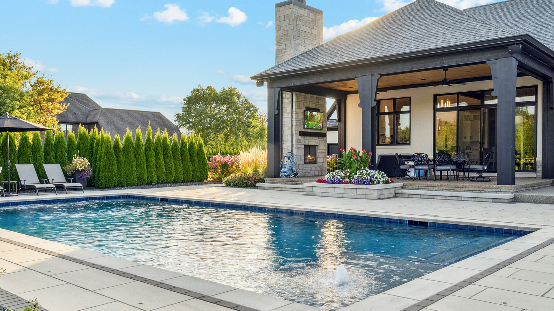 The centerpiece of the backyard is a large brick paver patio that frames and elevates the formal pool. The pavers give the yard a timeless, grounded feel while providing plenty of room for lounging, entertaining, and moving comfortably throughout the space.