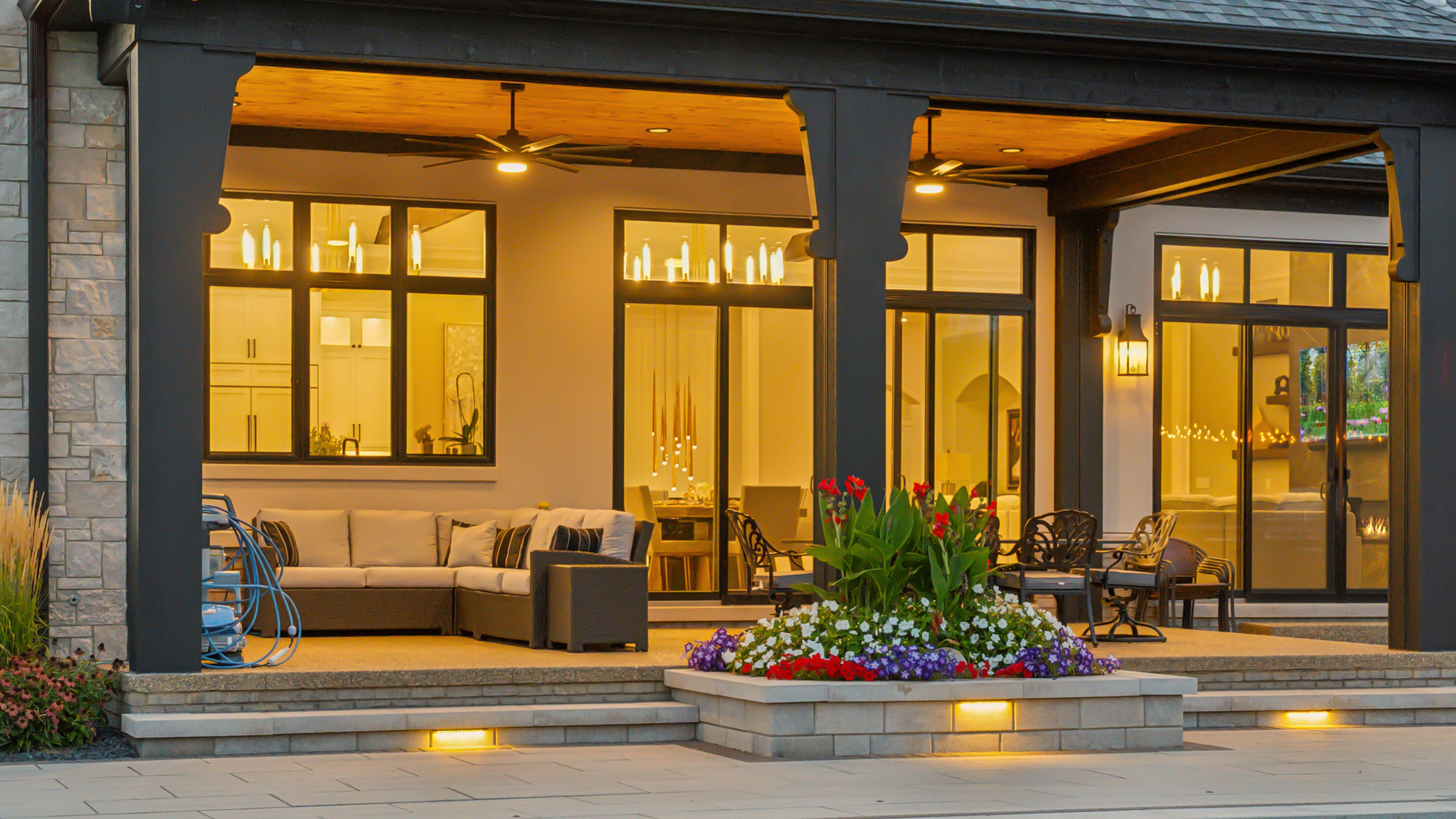 This landscape is designed to feel both carefree and refined, blending modern simplicity with classic structure. The space is organized around layered hedges that create a sense of order while keeping the look soft and inviting. These plantings are paired with broad washes of color, adding depth and vibrancy without overwhelming the clean lines of the design.